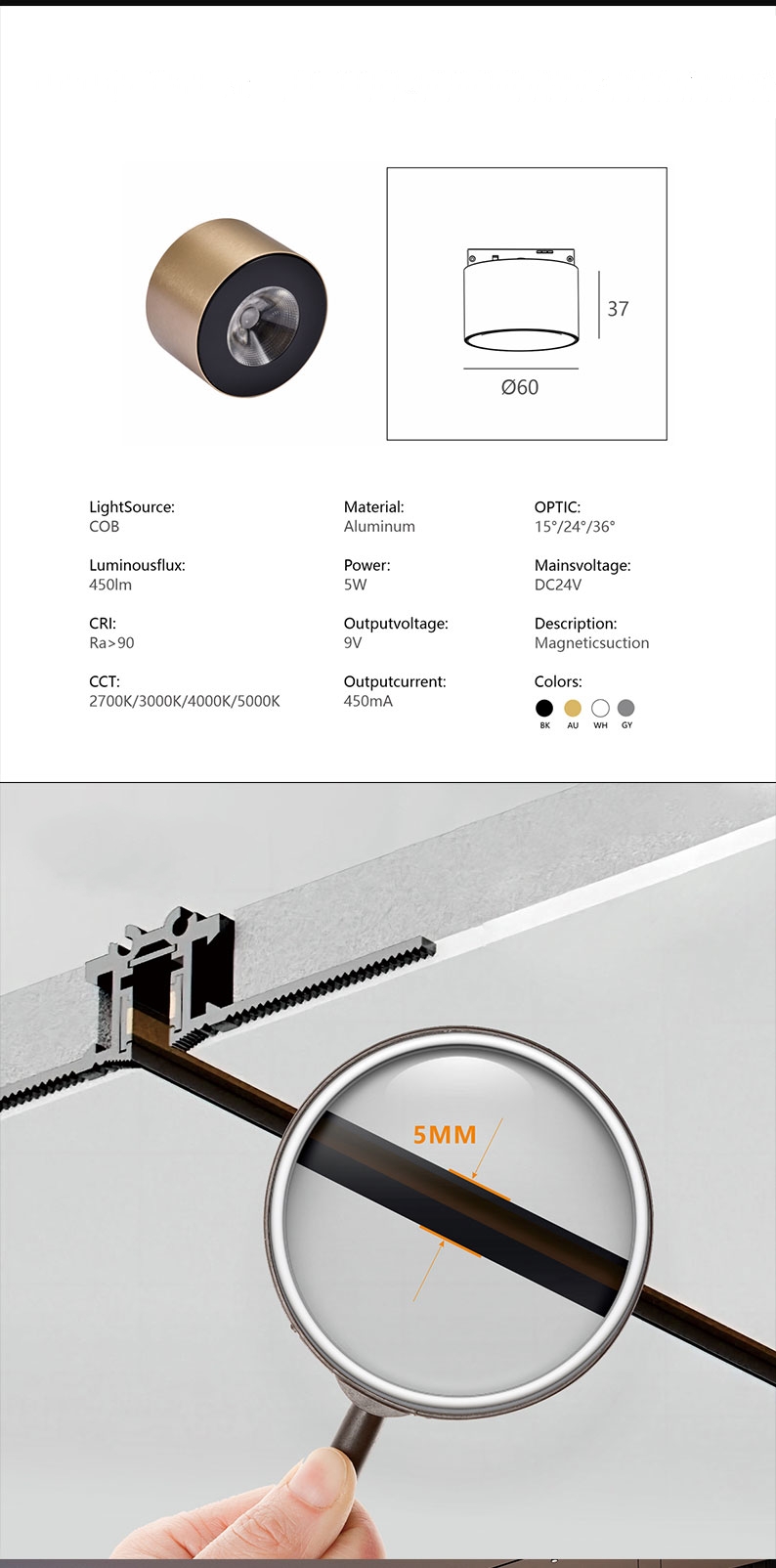 5mm Magnetic Track Light Mini Spotlight with Brass Aluminum Material Suitable for High-end Venues, Houses, Hotels